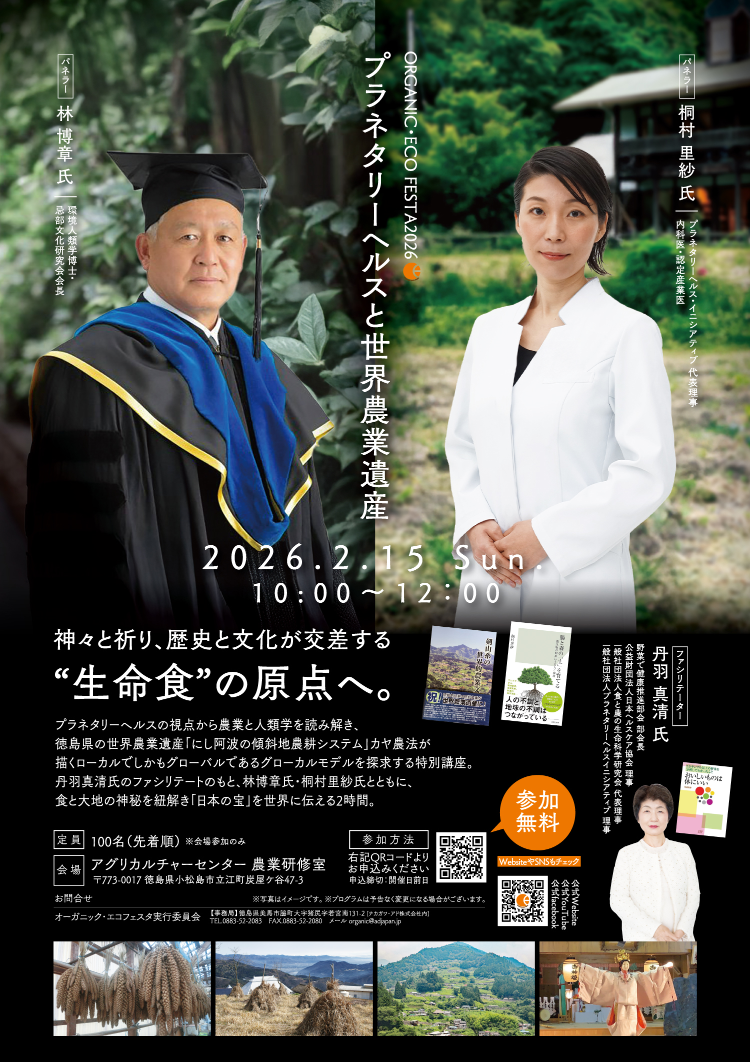 プラネタリーヘルスの視点から農業と人類学を読み解き、徳島県の世界農業遺産「にし阿波の傾斜地農耕システム」カヤ農法が描くローカルでしかもグローバルであるグローカルモデルを探求する特別講座。丹羽真清氏のファシリテートのもと、林博章氏・桐村里紗氏とともに、食と大地の神秘を紐解き「日本の宝」を世界に伝える2時間。